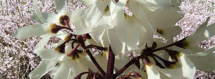 Il existe plusieurs variétés, exemple : Abeliophyllum « roséum » fleur d'un blanc rosé.