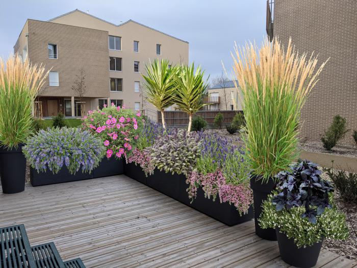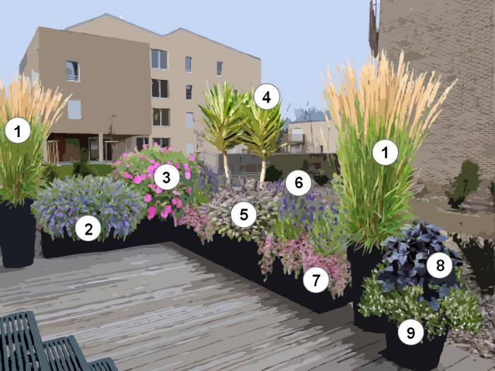 Ma terrasse est au rez-de-chaussée d’une copropriété récente. Peu de passage et pas de vis-à-vis devant chez moi. Quelques végétaux bas, dont je joins la photo, ont été plantés autour de la terrasse par le promoteur.