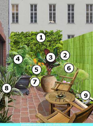 Sur ce plan de jardin thaï, des plantes vertes structurent l’ensemble. Les bambous sont plantés dans des bacs enterrés dans la fosse de plantation (1), les aralias (2) sont plantés dans la fosse comme le canna panaché (5) et les graminées (7).