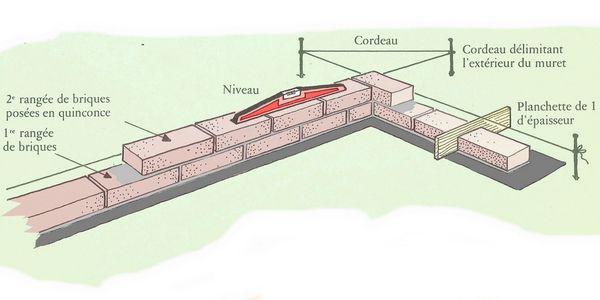 Tracez sur le sol l’emplacement de la construction et ses limites, soit, par exemple, la réalisation d’un muret de briques de simple épaisseur. Voir ici les traçages géométriques.