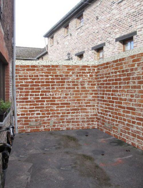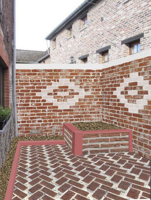 À l’angle du mur, une jardinière en briques et en bois. (bois traité à cœur) Sur les murs, des motifs en losange sont faits avec un lavis de peinture blanche.