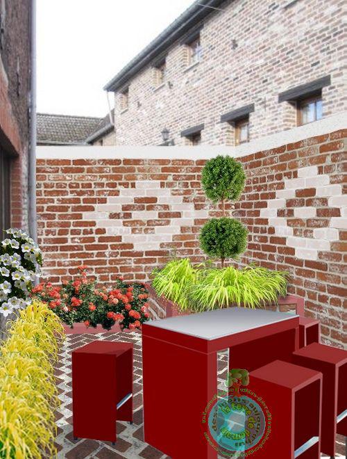 Préparation pour implanter le jardin : Il faut mettre en œuvre une chape de béton qui supporte un dallage en en briques posées en chevrons par bande et jointoyée. Vérifier le bon écoulement des eaux pluviales.