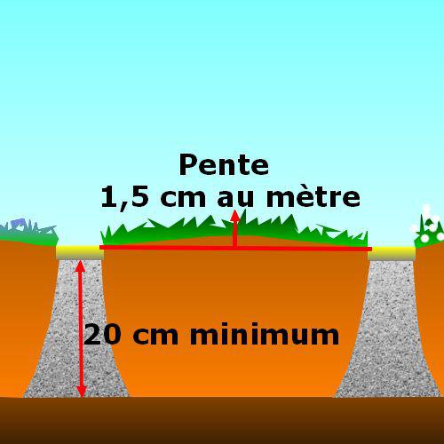 Tassez énergiquement avec une petite dame le fond des petites tranchées. Comblez-les avec un béton de type « béton à bordure », pas un béton gras, il casserait. Attention ! la crête de ces petites fondations ne doit pas dépasser la largeur des dalles qui forment le damier (voir le petit plan).