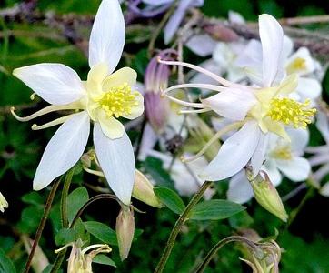 Fréquente en Espagne, cette ancolie fleurit en mai avec des fleurs aux pétales blancs et aux sépales bleus.