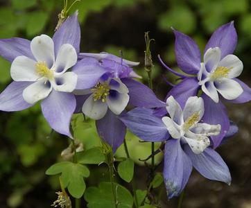 Aquilegia caerulea : indigène des montagnes Rocheuses d’Amérique du Nord, elle atteint parfois 80 cm de haut. Les feuilles sont larges, les fleurs, bien déployées, montrent des pétales à limbe blanc et un éperon en béquet bleuté (à noter que les sépales bleus sont deux fois plus développés que les pétales), il arrive que certaines variétés soient dépourvues d’éperon. Parmi les variétés décoratives :