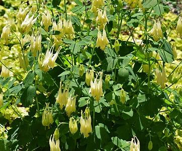 Aquilegia canadensis : Plante à fleurs jaunes ou rouges originaire d’Amérique du Nord, fleurit en mai-juillet avec des fleurs pendantes aux sépales jaunâtres, parfois mêlés de nuances rouges, les pétales sont d’un jaune très vif qui tranche sur l’ensemble.
