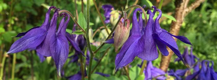 Aquilegia vulgaris (ancolie des jardins) : elle peut atteindre 1 m de haut, sa tige tend à se ramifier dans sa partie supérieure, les fleurs sont pendantes à limbes bleus, la floraison a lieu entre mai et juillet. Il existe de nombreux hybrides :