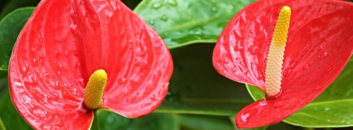 Originaires d’Amérique du Sud, les Anthuriums sont facilement reconnaissables avec leurs inflorescences, formées d’un spadice de 7 cm de longueur formé par de minuscules fleurs blanches ou jaunes et entouré par une spathe de couleur vive. Ces spathes, dans le cas d’Anthurium scherzerianum, sont rouge écarlate et brillantes. Les feuilles vertes, elles aussi brillantes, peuvent atteindre 7-10 cm de long.