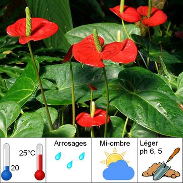 N’exposez pas votre anthurium à lumière directe du soleil et maintenez une température ambiante aux alentours des 20 à 25 °C. Il pourra supporter plus en été.