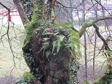 L’accumulation des feuilles mortes et autres morceaux de bois qui se décomposent en terreau sur la tête des trognes permet le développement de véritables petits jardins miniatures composés de fougères, plantes vivaces.