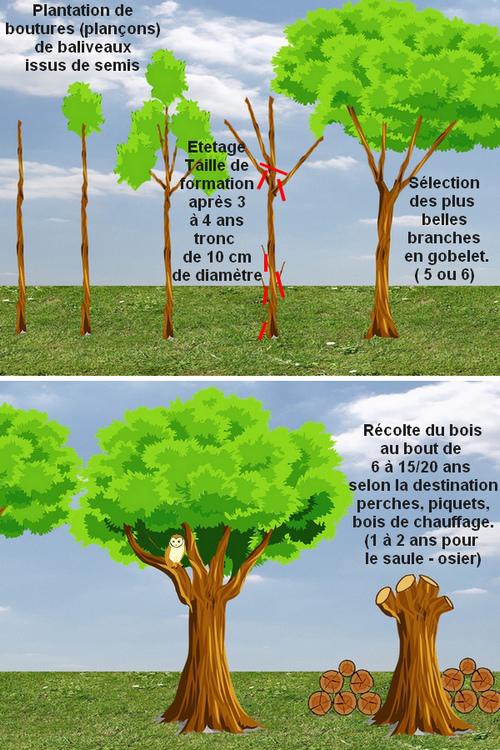 La périodicité des tailles varie selon l'éspèce d'arbre ététée et la destination du bois récolté. de 1 ans pour le saule (osier) à 10/15 ans pour du frène et même 20 ans pour du chène.