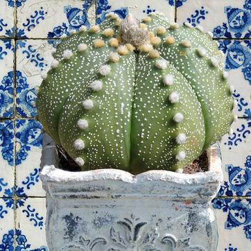 Appelé « mitre d’évêque » ou « cactus étoilé ». Ce beau petit cactus recouvert de petites taches blanches, offre une tige globulaire qui comporte généralement 5 côtes bien définies. Les fleurs font de 4-5 cm. (image du haut)