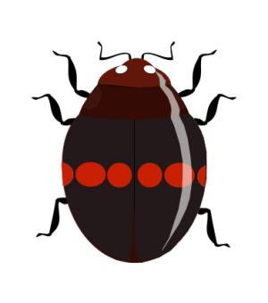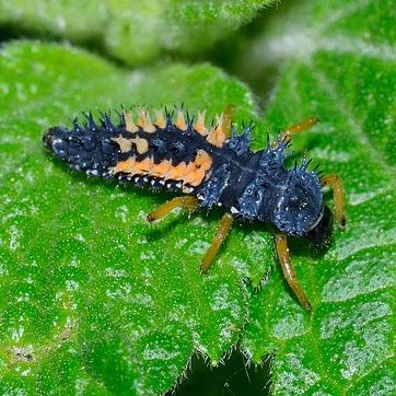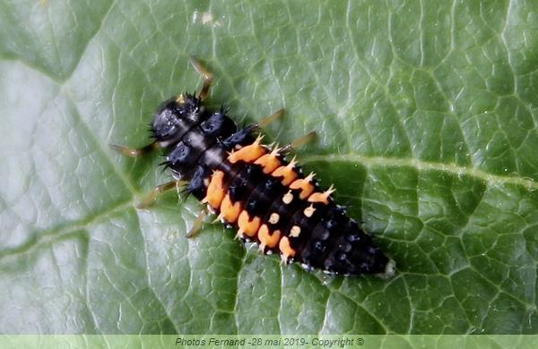 Cette grosse coccinelle (8 mm) est difficile à différencier des autres, car elle peut arborer les couleurs et le nombre des points des autres coccinelles ! Les larves qui mesurent jusqu’à 10 mm sont elles facilement reconnaissables avec leurs deux bandes latérales orange au niveau de l’abdomen.