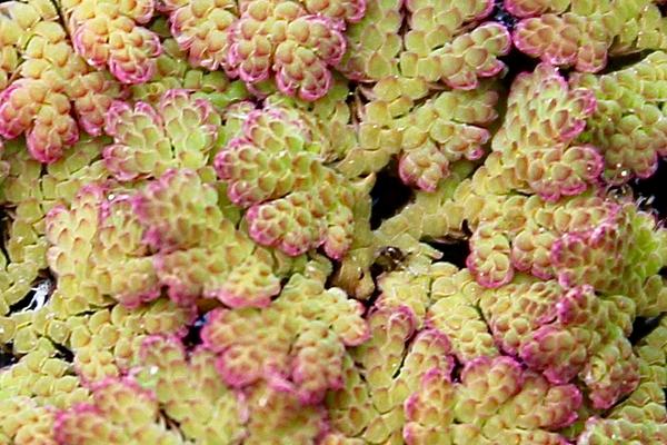 C’est une petite fougère tropicale aquatique dont les frondes vert grisâtre haute de quelques millimètres seulement au-dessus de la surface de l’eau, forment des tapis vert tendre. Lorsque les températures baissent en automne ou sous le plein soleil brulant de l’été les frondes se colorent de reflets violacés.