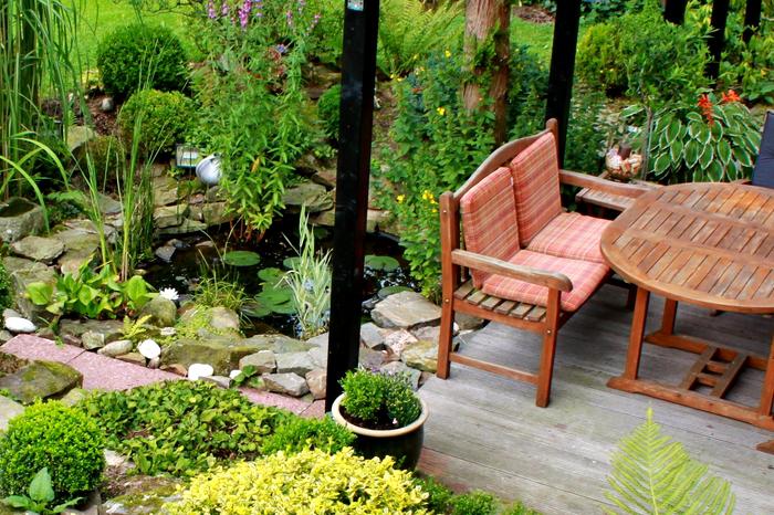 Un bassin près d’une terrasse, si il est doté d’un mouvement d’eau et peuplé de quelques poissons ne doit pas vous faire craindre la prolifération des moustiques. Avec un léger éclairage comme celui-ci à la tombée de la nuit le gazouillis de la fontaine et le miroir de l’eau vous appelleront à la rêvasserie.