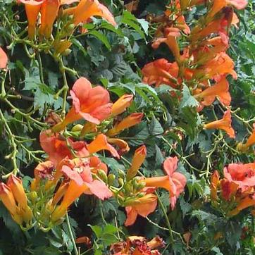 La Bignone à grandes fleurs a des rameaux de 4 à 5 m qui doivent être palissés. Feuilles composées pennées, à folioles ovales. Fleurs en grandes panicules terminales, en trompette, d’un beau rouge orangé.