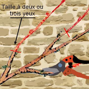 En fin d’hiver (mars), lorsque la charpente est établie après la taille de formation, taillez très court (3 yeux) les branches de l’année précédente.
