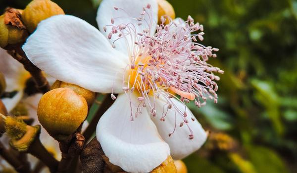 Une fois fécondées, les fleurs du roucou donnent des fruits encapsulés épineux mais doux au touché.