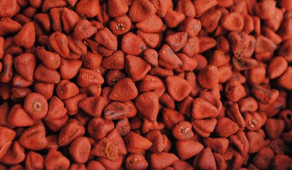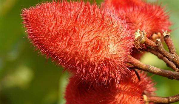 À maturité les capsules s'ouvrent pour laisser apparaitre des graines 10 à 40 graines d'un rouge foncé presque brun enrobées d'une pulpe rouge. C'est cette pulpe rouge qui fournira le colorant.
