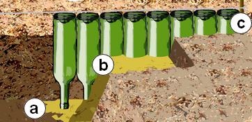 b - Si votre terre est très caillouteuse ou à grosses mottes, mettez une couche de sable au fond et comblez-les autour des bouteilles avec du sable jusqu’à 10 cm de la hauteur finale. Cela facilite le travail.