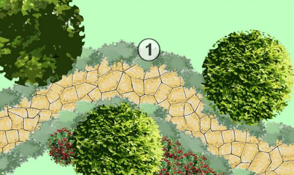 La frontière entre les allées ou le gazon et les massifs peut être matérialisée avec une franche de plantes basses tapissantes.