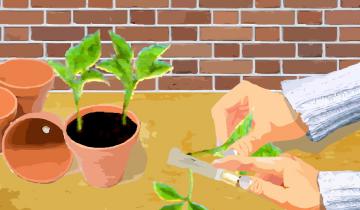coupez-les juste sous un nœud, c’est-à-dire sous le point de départ des feuilles sur la tige. Préparez un mélange léger pour l’enracinement (une part de terreau et une part de sable grossier), et remplissez-en des pots de 8 cm ou des terrines. Trempez la base des boutures dans de la poudre contenant une hormone d’enracinement, et plantez en enfonçant les tiges de 2 cm dans les pots ou dans la terrine. Ne disposez pas plus de trois/quatre boutures par pot. Arrosez et étiquetez, en inscrivant le nom de la variété et la date de bouturage.
