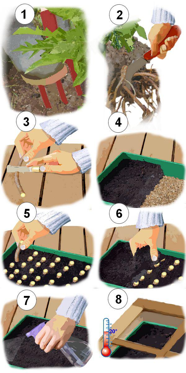 Faites dans le terreau des trous avec un petit bout de bois et insérez les tronçons de racines. Il ne faut comme pour les autres boutures jamais les enfoncer directement sans avant-trou, car la base serait blessée. 5