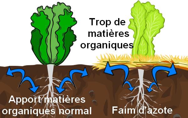 Il est alors facilement compréhensible que lorsque l'on apporte une grande quantité de matières organiques non décomposées les ressources d'azotes disponibles dans le sol soient majoritairement mobilisées pour alimenter les bactéries et les champignons qui aident à leur décomposition.