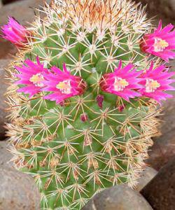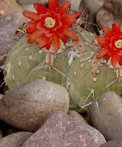 Cactus globulaire de petite taille.Tiges de de 6 cm de diamètre portant des fleurs allant du rouge au rose