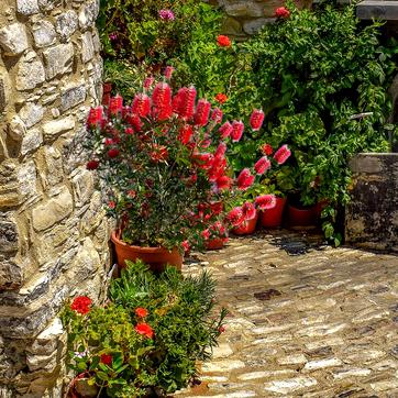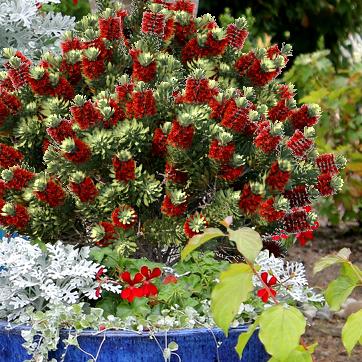 Le rouge écarlate de leurs fleurs, pour les plus courants, leur longue floraison et leur feuillage persistant les rendent intéressants pour animer les terrasses ou même un grand balcon, d’autant plus qu’il supporte très bien les tailles répétées.
