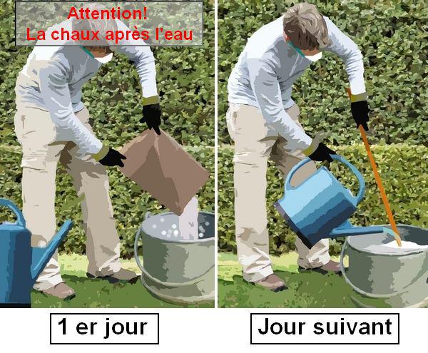 La préparation se passe avec un large pinceau ou à la brosse, de la base du tronc jusqu'au départ des premières branches charpentières. Sur les très vieux arbres à l'écorce crevassée, il faut plusieurs couches, avec une journée d'intervalle entre chaque passage.