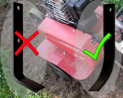 Ne jamais utiliser des couteaux de fraise en équerre. Ces couteaux forment une « semelle de labour », surtout si le sol est un peu argileux qui s’oppose à la fois à l’évacuation de l’eau en excès lorsque le terrain est très mouillé, à la remontée de l’humidité profonde en cas de sécheresse et bloque la mise en place des racines.