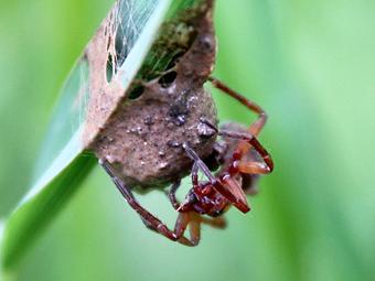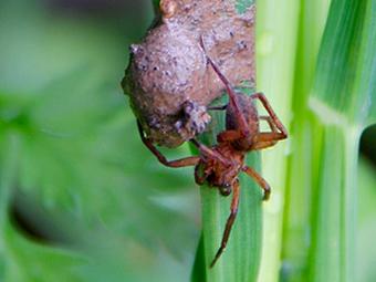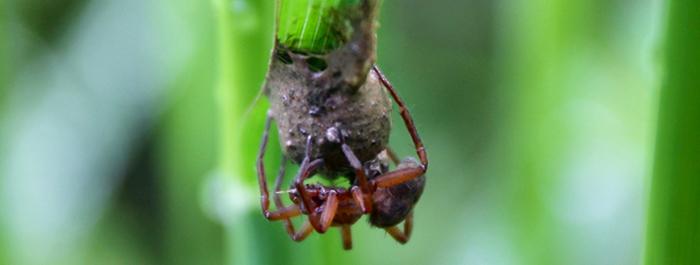 À première vue, on pourrait croire à une petite araignée maçonne. C’est un peu cela, mais uniquement pour la finition ! Car le nid façonné par l’Agroeca brunnea n’est pas entièrement constitué de boue. En bonne araignée, elle a filé un cocon. Une petite lanterne suspendue à un brin d’herbe. À l’intérieur, une cinquantaine d’œufs. Le mets préféré, hélas, des larves du Gelis, une petite guêpe de la grande famille des Ichneumons.