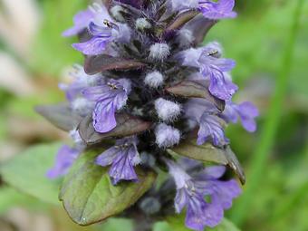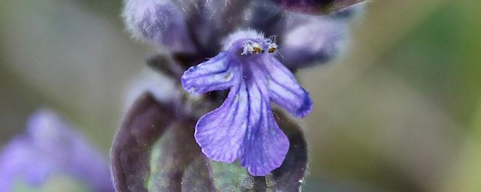 Comme chez ses voisines, les fleurs de la Bugle rampante présentent deux lèvres ouvrant sur un long tube nectarifère. La lèvre inférieure à trois lobes reçoit les butineurs. Au-dessus, la lèvre supérieure est atrophiée. Pour ne pas dire inexistante. Pas d’auvent protecteur donc pour étamines et styles qui en débordent largement.