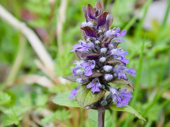 Elle côtoie le Lamier pourpre et le Lierre terrestre au pied des haies. Pas de risque de confusion. La Bugle rampante dresse un bel épi serré où le bleu violacé des petites fleurs se mêle au vert puis au bronze d’un feuillage qui fonce et rétrécit en progressant vers le sommet de la pyramide.