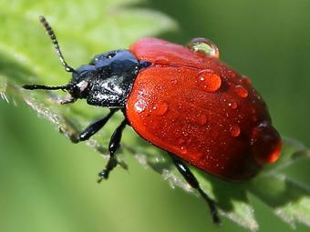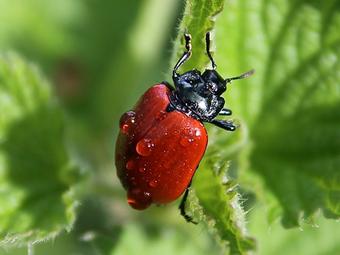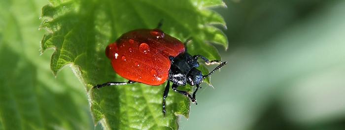 Non, ce n’est pas une coccinelle sans tache… Ce bel insecte rouge vif cache bien son jeu. À l’inverse de son quasi-sosie, en effet, il est membre d’une famille à la très mauvaise réputation : les Chrysomèles !