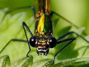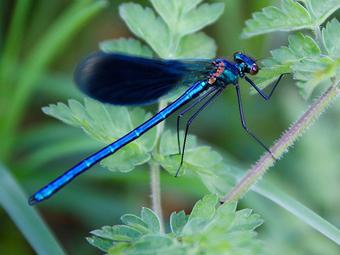 Leurs ailes très finement nervurées - largement marquées de bleu foncé chez le mâle, translucides et uniformément verdâtres chez la femelle - en font d’excellents voiliers. Et de redoutables prédatrices puisqu’elles chassent en vol. Elles sont peu discrètes, certes, mais aussi vives que légères. Et rien ne doit leur échapper avec de tels yeux. De véritables petites billes pour une vue à 360° sans doute.