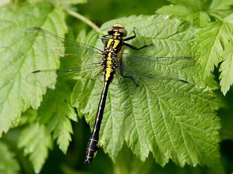 Aisément reconnaissable à sa dominante jaune et noir, il se distingue aussi par les croissants de ses gros yeux verts tirant sur le brun. On remarquera encore l’extrémité de son long abdomen, épaissie en forme de massue, sans tache jaune sur le dessus. Il s’agit ici d’un mâle dont la « pièce copulatoire » - comme disent sans rire les entomologistes - est bien visible. Ainsi que la bordure distinctive incurvée de ses ailes postérieures.