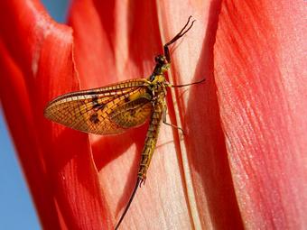 La femelle meurt sitôt la ponte au fil de l’eau et le mâle attend la fin dans une sorte de paisible indolence. C’est sans doute le lot de celui-ci. Les pattes avant redressées, l’abdomen arqué, prolongé de trois longs cerques, il est comme endormi sur une fleur de tulipe.