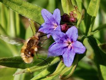 La floraison qui débute tranche avec le jaune et le blanc des fleurs voisines. Regroupées en petites grappes feuillues, les corolles à l’aspect un peu chiffonné hésitent entre bleu pâle et bleu violacé. Avec des nuances pourpres plus ou moins soutenues. D’où son nom.