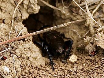Creuser, façonner, consolider… Que de débris ! Le grillon a une technique éprouvée pour leur évacuation : la sortie à reculons. Les pattes arrière repoussent énergiquement les gravats jusque sur le seuil. Elles sont solidement équipées pour pareille besogne. De véritables râteaux.