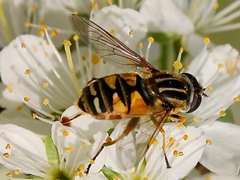 Outre la fameuse nervure en vague propre aux ailes des Éristales, l’Hélophile suspendu se distingue évidemment par les rayures jaune -clair de son thorax et les taches « en sablier » de son abdomen, jaune-ocre puis crème en écho à sa toison faciale.