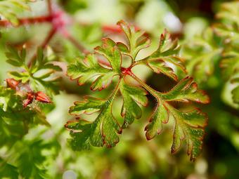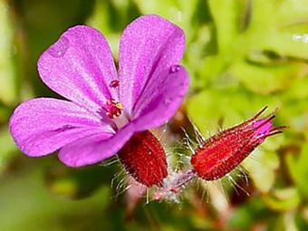 Pour couronner le tout, les tiges poilues sont baignées d’un intense rouge-sang. Les sépales des boutons floraux également. Un rouge-sang qui paraît même suinter du feuillage… Heureusement, roses, plus ou moins violacées, les petites fleurs sont charmantes. On leur donnerait le Bon-Dieu sans confession. Gare malgré tout. Excellent couvre-sol, l’Herbe-à-Robert est vite envahissante.