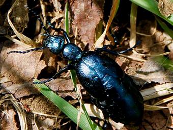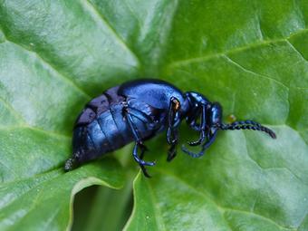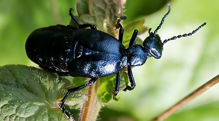 Indolent, le Méloé ne peut guère compter sur la fuite, ni la contre-attaque, en cas de dérangement. Mais il sait très bien faire le mort. Un liquide huileux, toxique et répulsif, suinte alors de certaines de ses articulations. Une dissuasion à peu de frais avant de reprendre tranquillement son chemin. L’occasion d’apprécier ses reflets bleutés, la fine ponctuation de ses courts élytres et de son thorax. Et le chapelet de ses antennes.