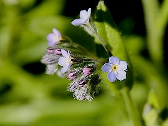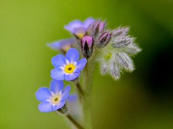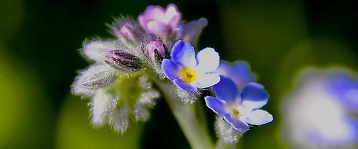 Lorsqu’une première fleur apparaît, au sommet de la tige ou d’un de ses rameaux, elle ouvre la voie à une grappe de minuscules boutons, enroulés en une crosse très resserrée. Fleur après fleur, le serpentin se dresse progressivement. D’abord rosées, les corolles au cœur jaune blanchissent pour virer rapidement au bleu pâle, parfois plus soutenu. Des lilliputiennes. Deux fois plus petites que leurs cousines des marais.