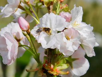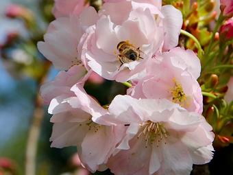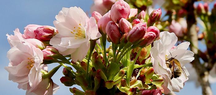 Syrphes, bourdons et abeilles en ont vite trouvé le chemin. Il est vrai que le Prunus serrulata ne fait pas les choses à moitié. Même les boutons floraux participent à la séduction. Leurs grappes rose vif battent énergiquement le rappel. Et les premières fleurs font le reste. Leurs corolles blanc rosé flottent dans le vent. Le moindre rayon de soleil en sublime l’éclatante sensualité.