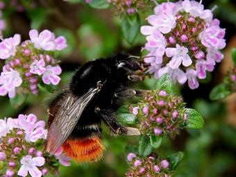 La nouvelle s’est vite propagée. La Sarriette est en fleurs ! Même le Bourdon des pierres a fait le déplacement. Il est pourtant plus gros que chacun des petits épis floraux… Mais il a la technique. Noir, la pointe de l’abdomen rousse flamboyante, il prend appui sur un épi voisin. Aucune difficulté alors pour plonger sa longue langue au cœur des minuscules fleurs roses. Quitte à changer régulièrement de position pour n’en oublier aucune.