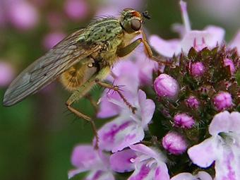 Les abeilles ne sont pas en reste ! Moins lourdes évidemment, elles s’installent directement sur un épi, pour l’explorer méticuleusement, sans même le faire ployer. Mais qui voilà ? La petite Mouche stercoraria. Comme quoi la Scatophage du fumier a des goûts bien plus raffinés qu’on l’imagine !
