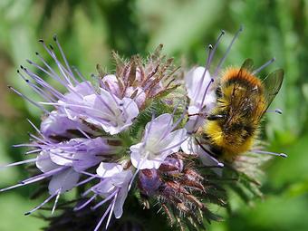 C’est un des plus petits bourdons du jardin avec le Bourdon des saussaies. Tout aussi précoce et infatigable butineur, le Bourdon des prés est à l’œuvre depuis la fin février. Toujours en mouvement, il sait aussi prendre son temps quand le filon en vaut la peine. Notamment sur les inflorescences de la ciboulette et de la phacélie.