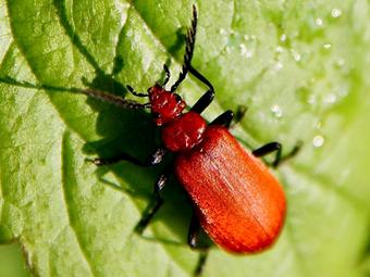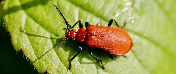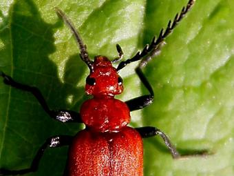 Rouge orangé sur les élytres, plus vif et luisant sur le corselet et la tête. Joli contraste avec le noir des pattes, des petits yeux et des longues antennes en forme de peigne. Impossible de le confondre, même pas avec son quasi-jumeau, l’autre Cardinal, en tout point identique, hors sa tête noire !
